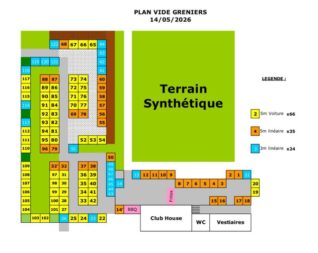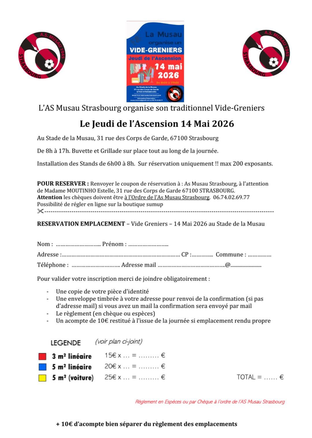 Attention n'oubliez pas l'acompte de 10€ pour le nettoyage, si l'emplacement est bien rendu propre et que tout a été respecté il sera restitué à la fin du vide grenier.